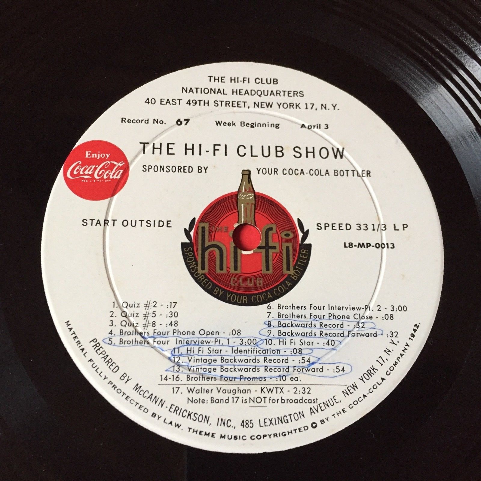 Coca Cola Hi-Fi Club ~ Rare DJ LP record - Record #67 & #68 from 1960
