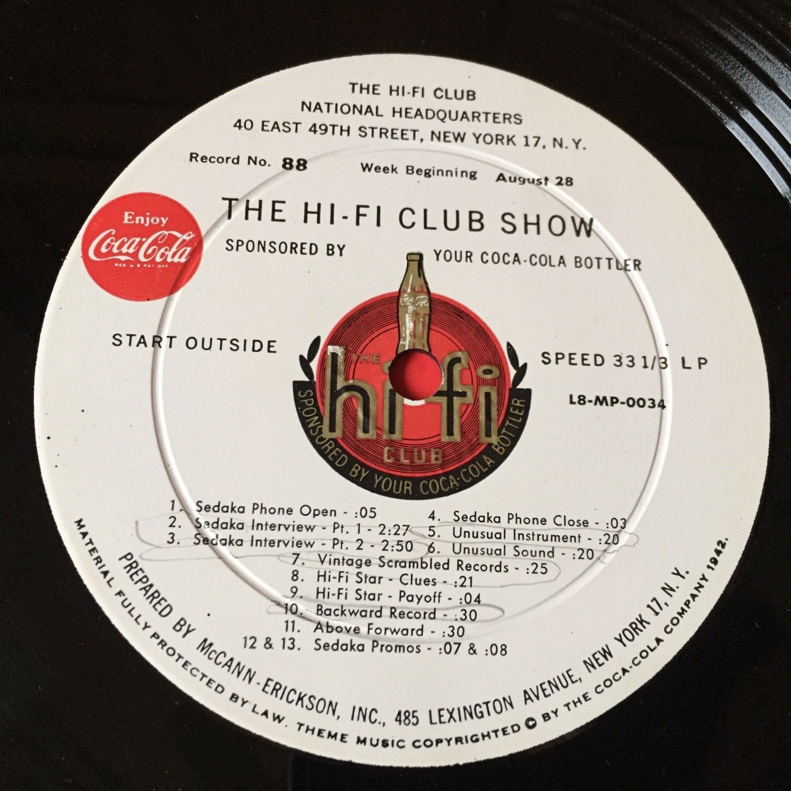 Coca Cola Hi-Fi Club ~ Rare DJ LP record - Record #88 & #89 - Aug 1960
