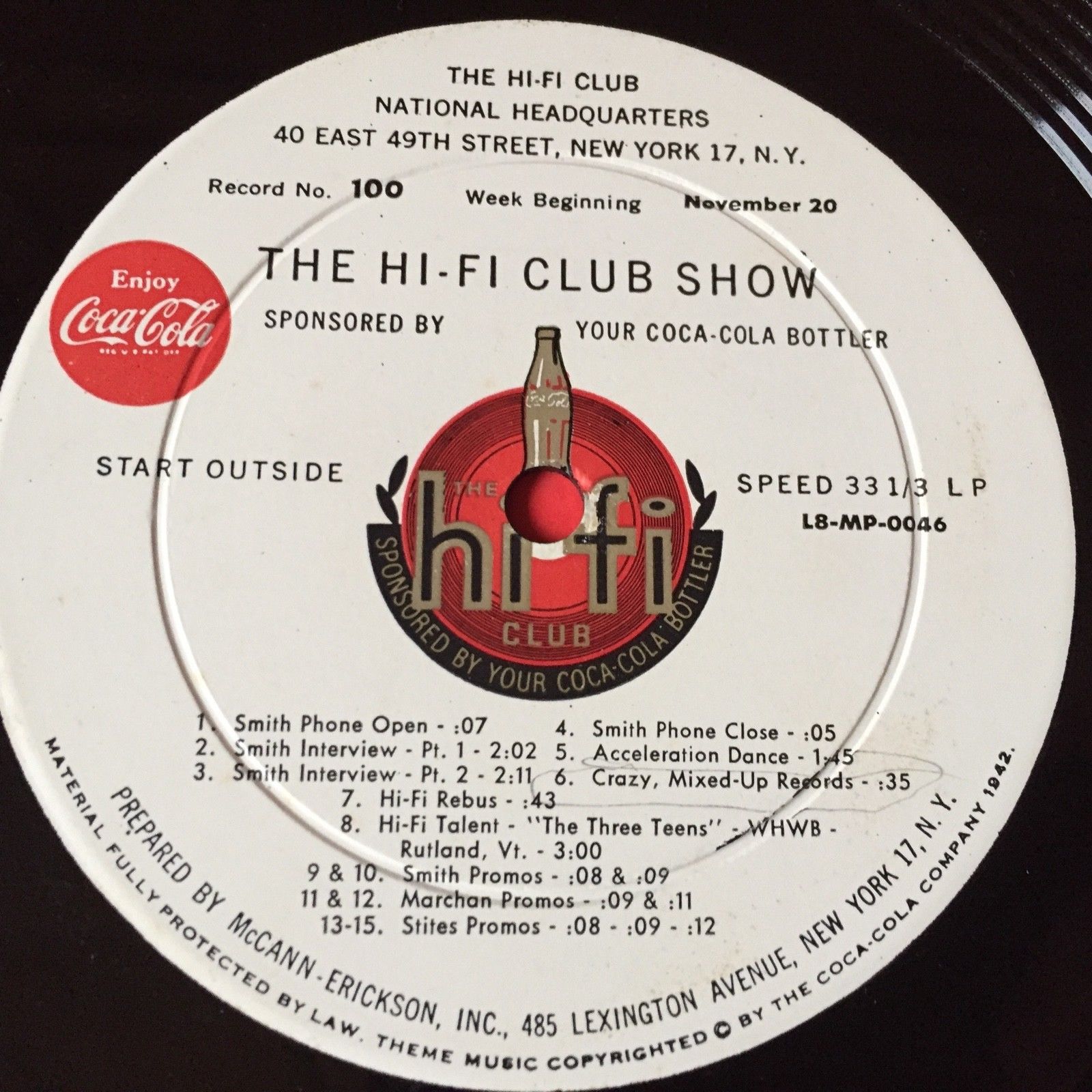 Coca Cola Hi-Fi Club ~ Rare DJ LP record - Record #100 & #101 - Nov 1960