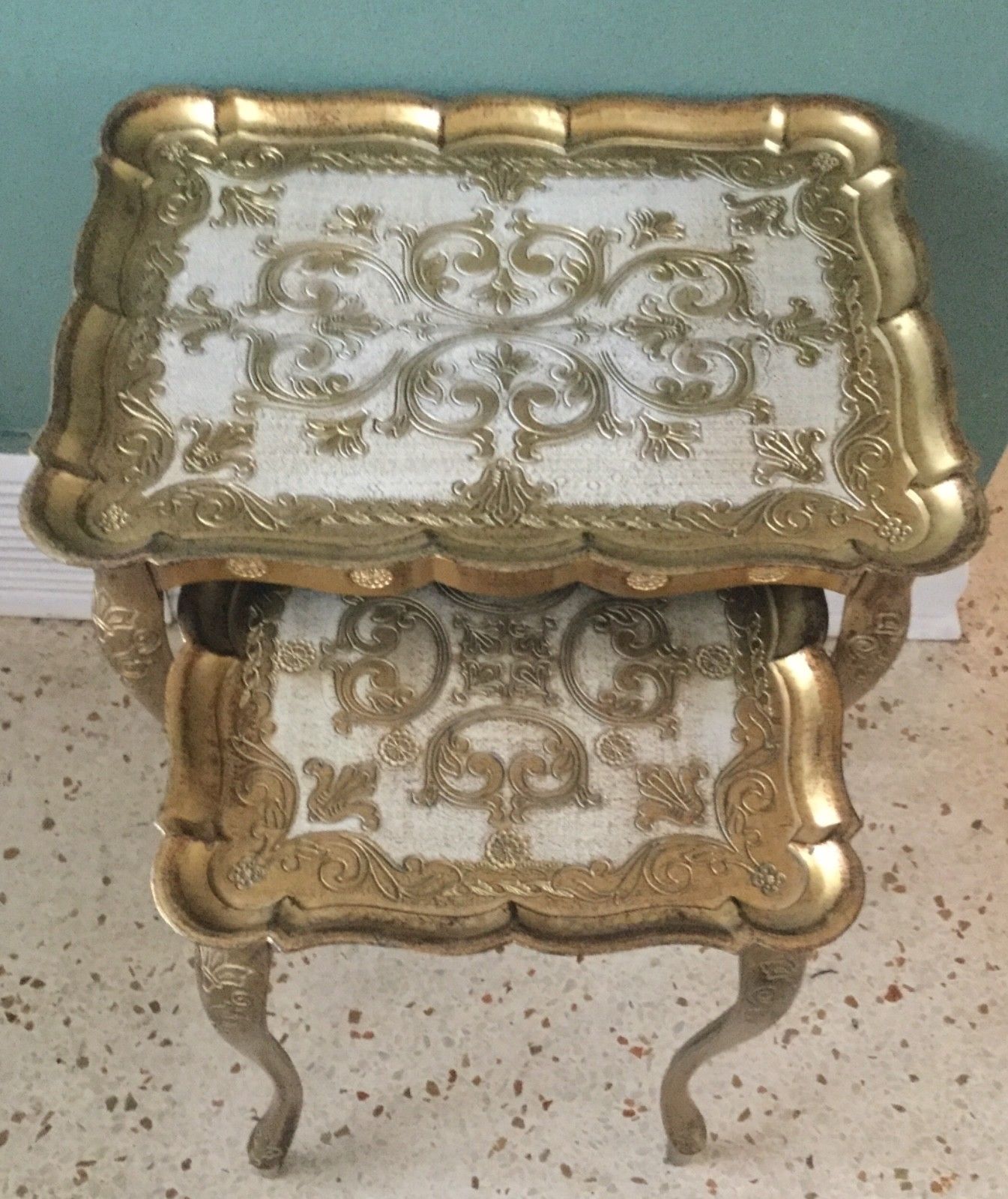 Title (ebay affiliate link): ITALIAN FLORENTINE GOLD TOLEWARE HOLLYWOOD REGENCY TWO NESTING TABLES