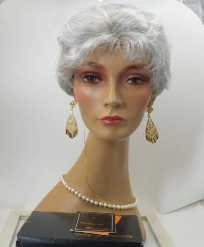 Title (ebay affiliate link): FEMALE HAT JEWELRY DISPLAY BUST PAINTED & TONY OF BEVERLY LAYERED GREY SHORT WIG