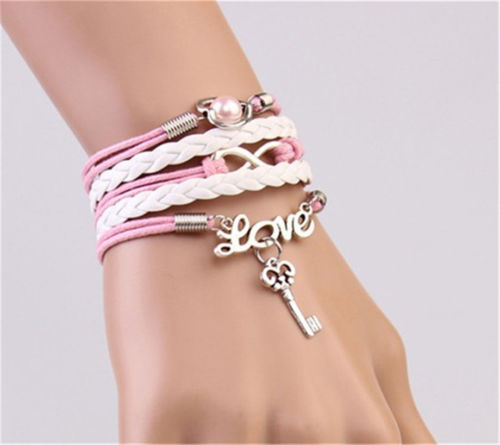Title (ebay affiliate link): NEW Infinity Heart Key LOVE Antique Silver Leather Charm Bracelet !!!