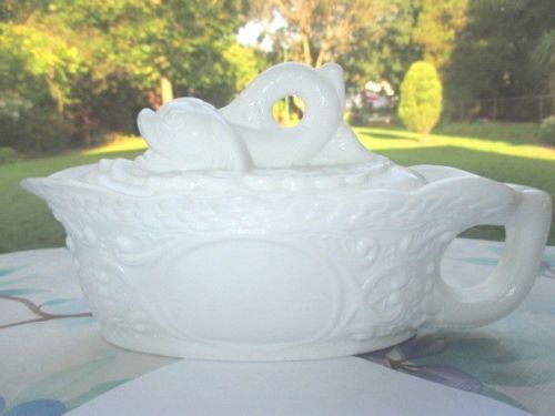 WESTMORELAND DEPRESSION MILK GLASS COVERED SAUCE DISH BOAT DOLPHIN FINIAL