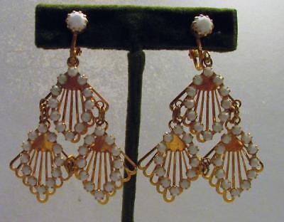 Vintage 50''s Chunky Milk Glass Rhinestone Drop Bead Clip On Earrings