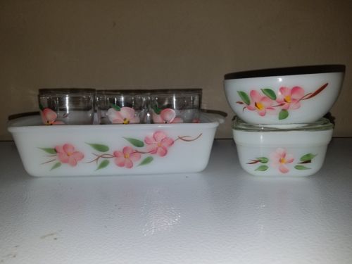 Title (ebay affiliate link): LOT Vintage Fire King Milk Glass Gay Fad Peach Blossom Casserole Dish bowl &more