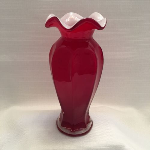 Title (ebay affiliate link): Vintage Fenton Unmarked Red & White Milk Glass Ruffled Vase