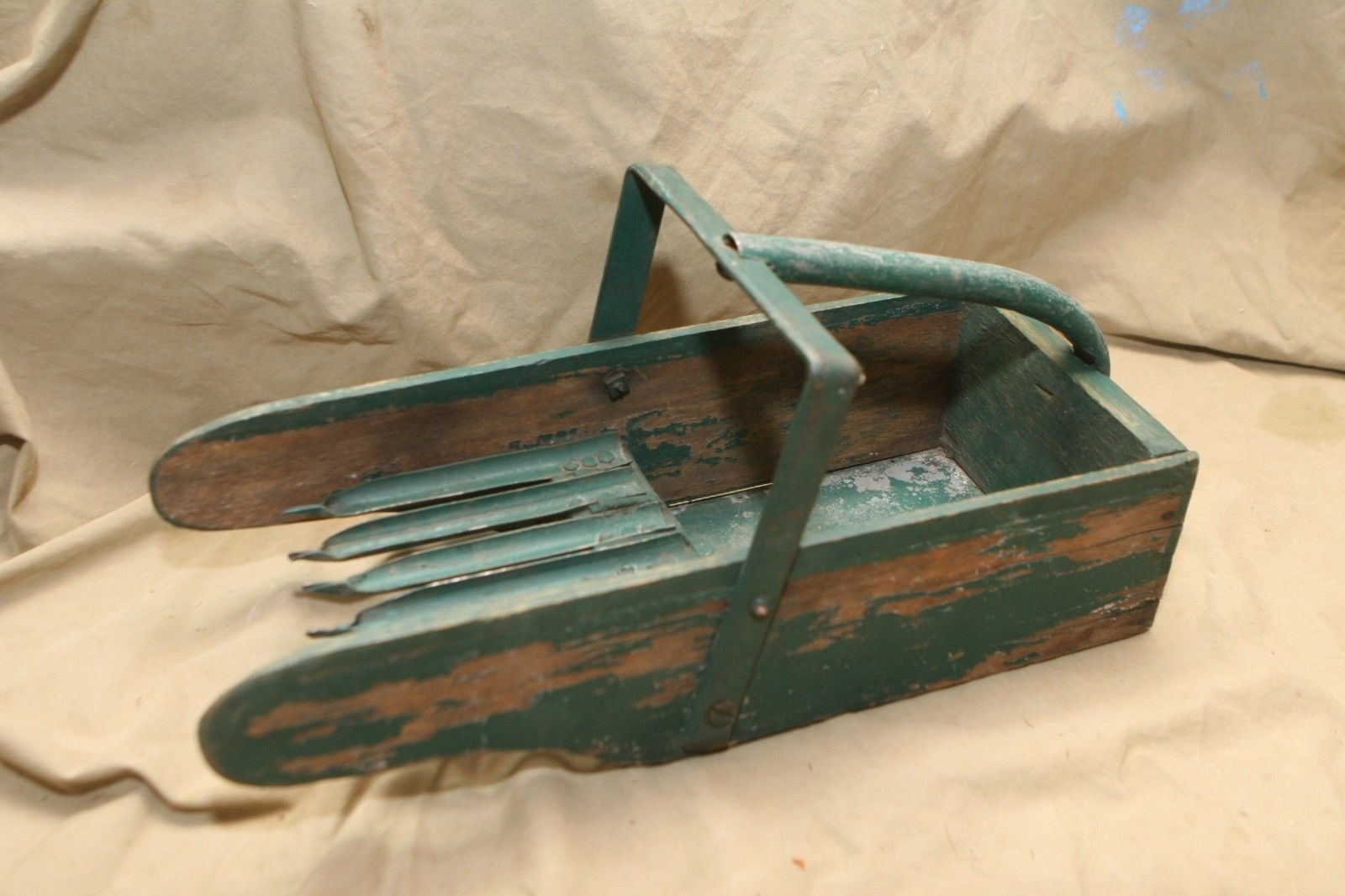Title (ebay affiliate link): Primitive Antique Printed Green Metal & Wood Cranberry Scoop Farming Tool