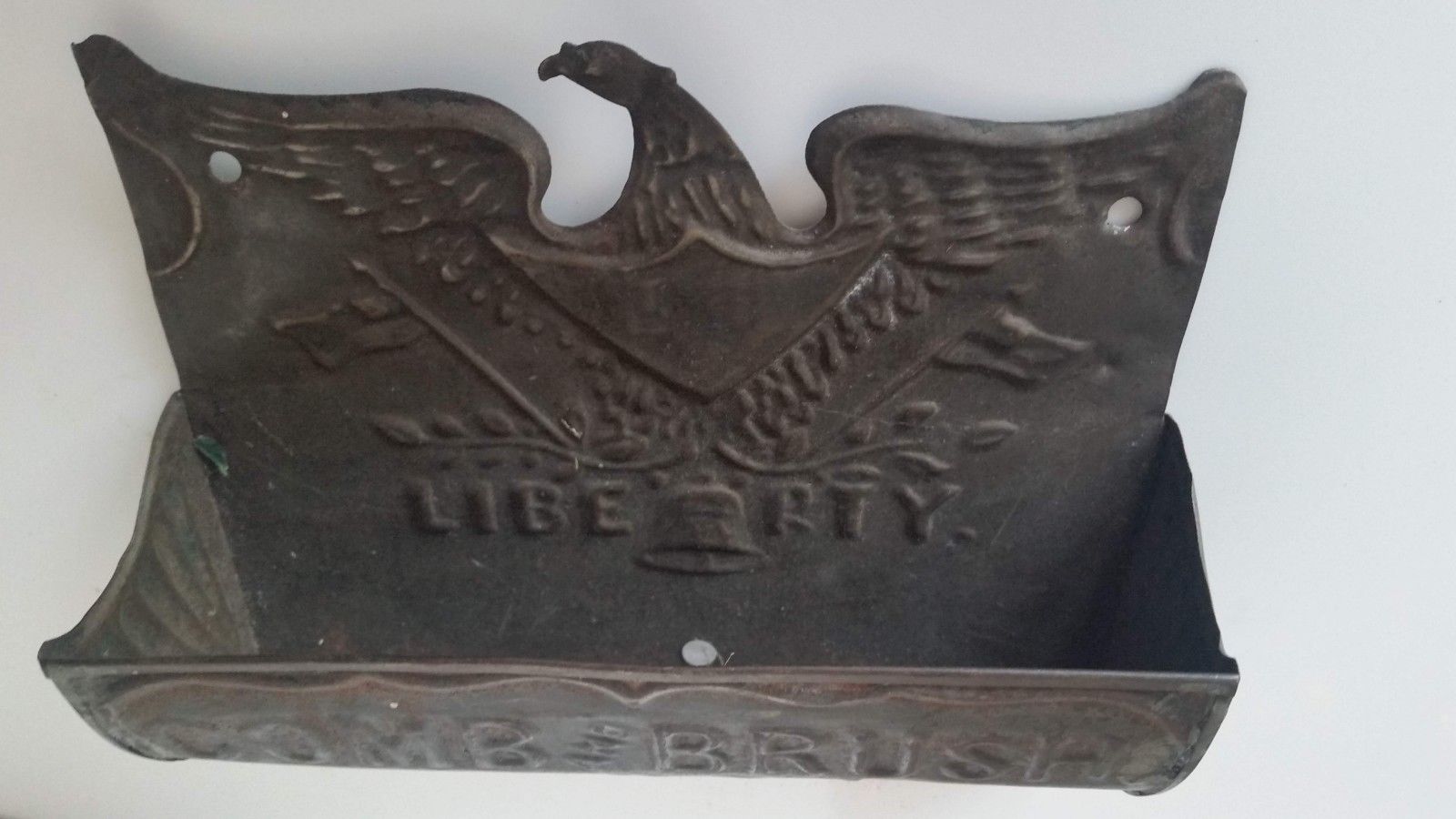 Title (ebay affiliate link): 19th c. Tin Comb Brush Wall Box. Eagle AAFA Liberty Bell toleware