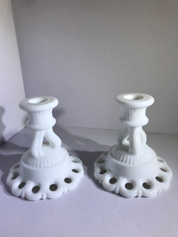 2-Fenton Vintage Ornate Candlesticks Milk Glass