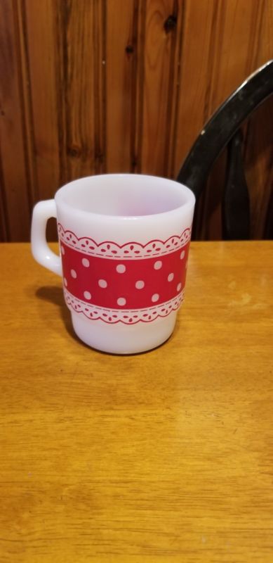 Title (ebay affiliate link): Vintage Red gingham plaid Fire King Milk Glass Coffee Mug/Cup- 1950-60s-
