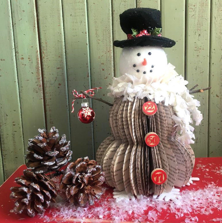 Title (ebay affiliate link): Primitive HANDMADE SNOWMAN from OLD BOOK~Winter~Farmhouse Christmas Decor