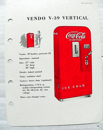 Title (ebay affiliate link): 1950''s "COCA-COLA" VENDO V-39 VERTICAL MACHINE~ SALESMAN FACT SHEET (FIRM PAPER)