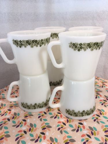 Title (ebay affiliate link): Vintage Pyrex Spring Blossom Crazy Daisy Set of Eight Milk Glass D Handle Mugs
