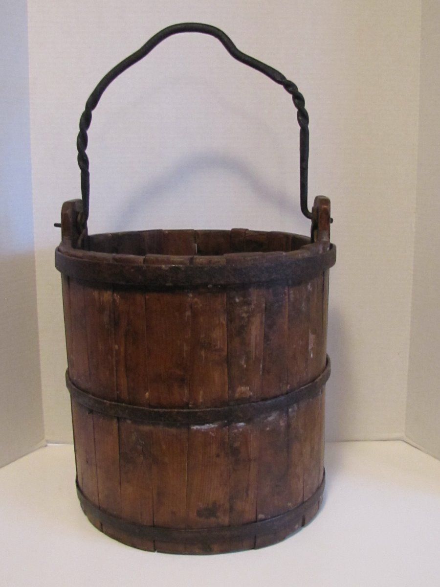 Title (ebay affiliate link): Metal Banded Wood Bucket w/ Wrought Iron Handle