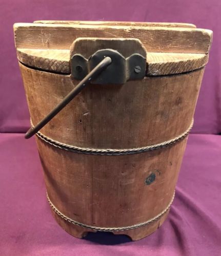 Title (ebay affiliate link): Vintage Braided Brass Banded WOODEN BUCKET with Handle & Unique Lid, 9" X 8-1/2"