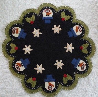 Title (ebay affiliate link): pRiMiTiVe Snowman Penny Rug~Candle Mat~Wool Felt Applique~Christmas Sample SALE~