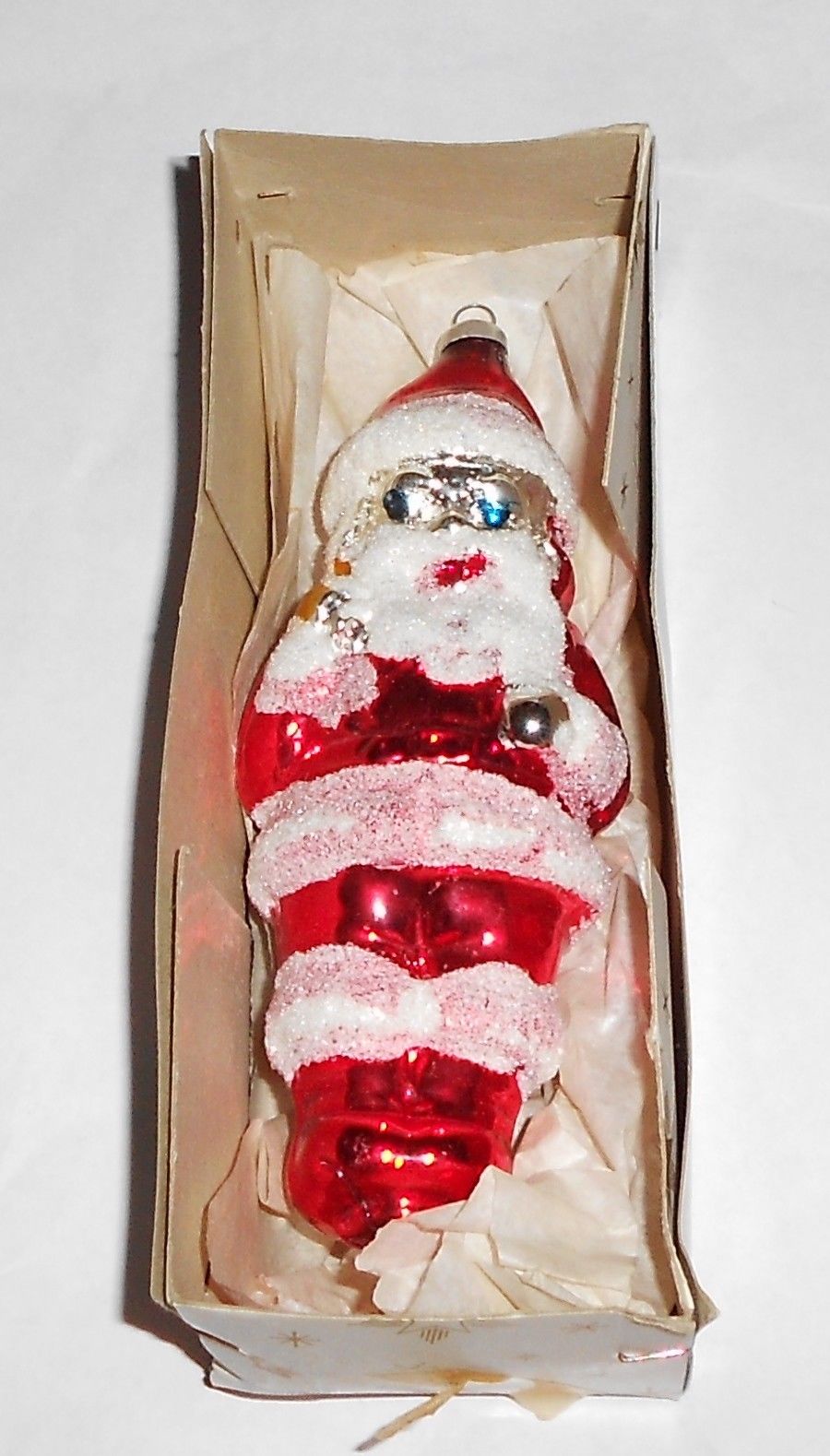 Title (ebay affiliate link): VTG SANTA CLAUSE CHRISTMAS TREE ORNAMENT~MERCURY GLASS~MICA TRIM w/ BOX (no lid)