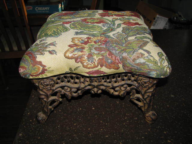 Title (ebay affiliate link): ANTIQUE FILIGREE CAST IRON WITH FLOWERS TAPESTRY COVER FOOT STOOL OTTOMAN 15 X 8