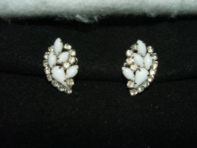 Vintage White Milk Glass Rhinestone Earrings Pretty!