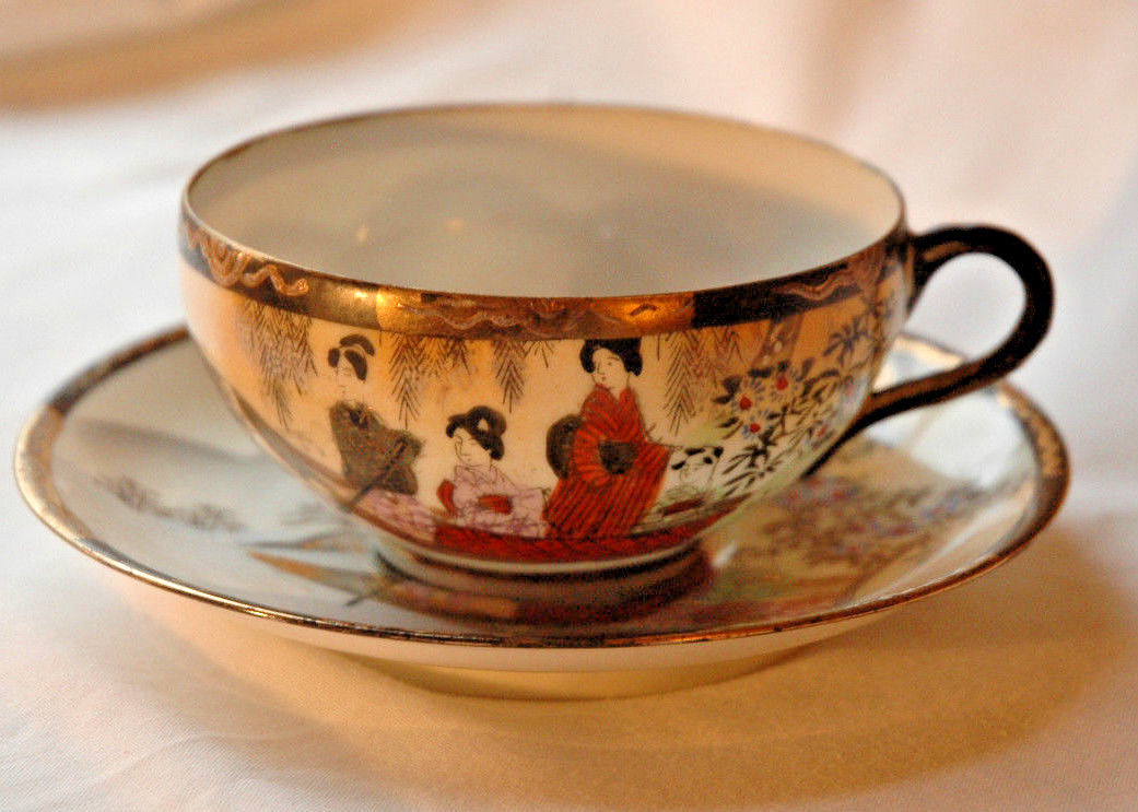 Title (ebay affiliate link): Vintage Japanese Porcelain Gilt & Black Geisha Scenes Tea Cup & Saucer Eggshell