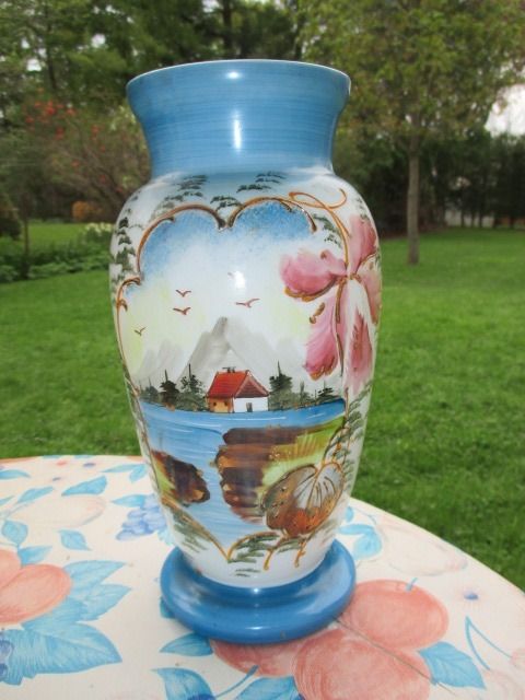 Title (ebay affiliate link): VICTORIAN BRISTOL GLASS MANTLE VASE HP ORCHID COTTAGE WATERWAY MOUNTAIN SCENE