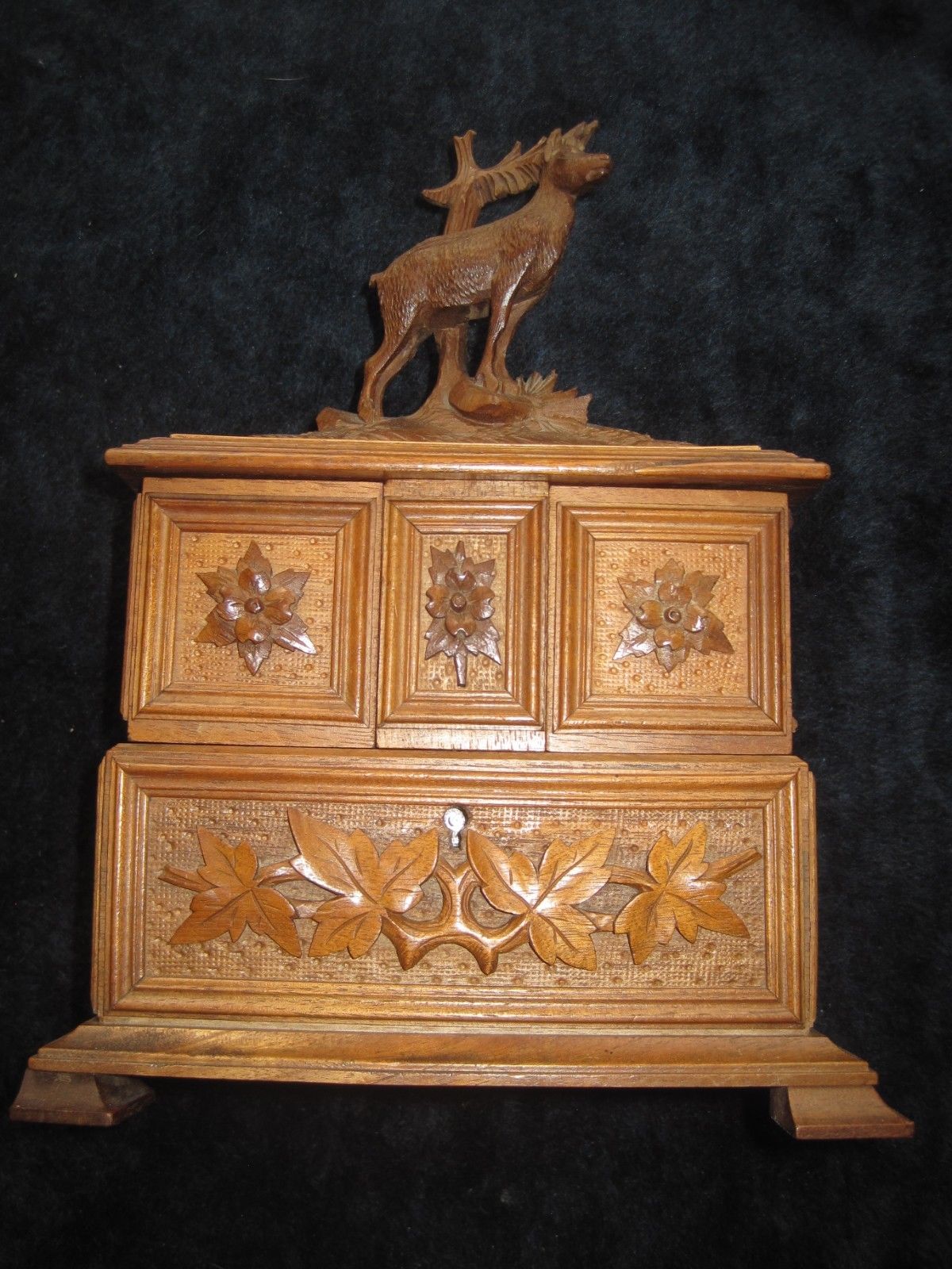 Title (ebay affiliate link): Antique Swiss Black Forest Wood Carved Trinket Jewelry Box Deer Edelweiss Brienz