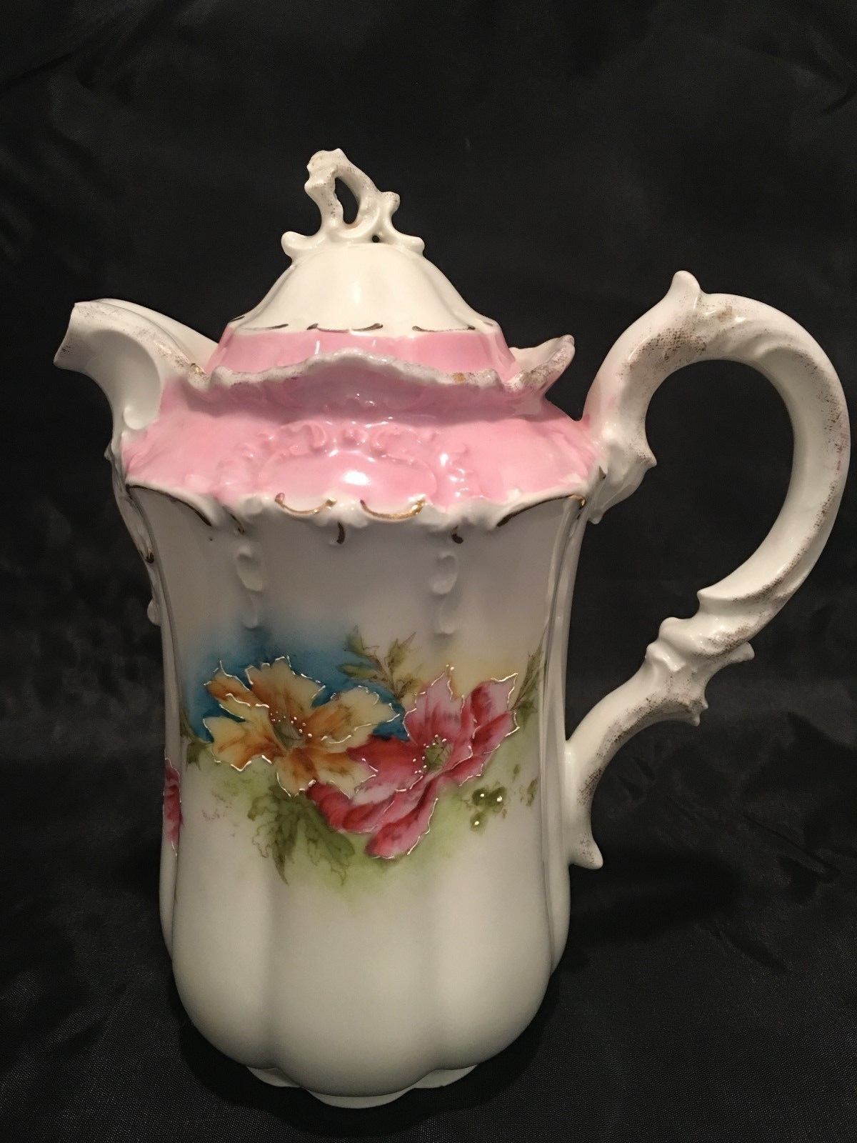 Antique Chocolate/Coffee Pot - Pink and Yellow flower, Gold, White