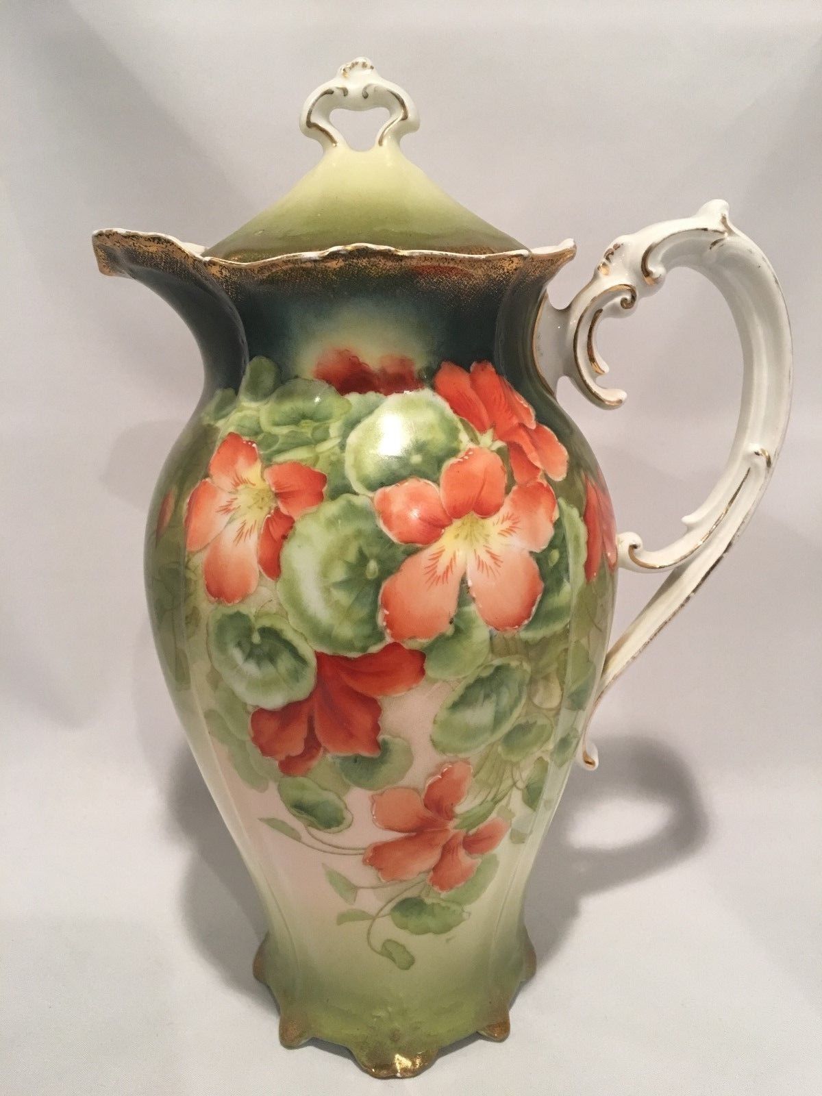 Antique Bavaria Chocolate Pot Red Flower Porcelain Pitcher Green Signed/Numbered