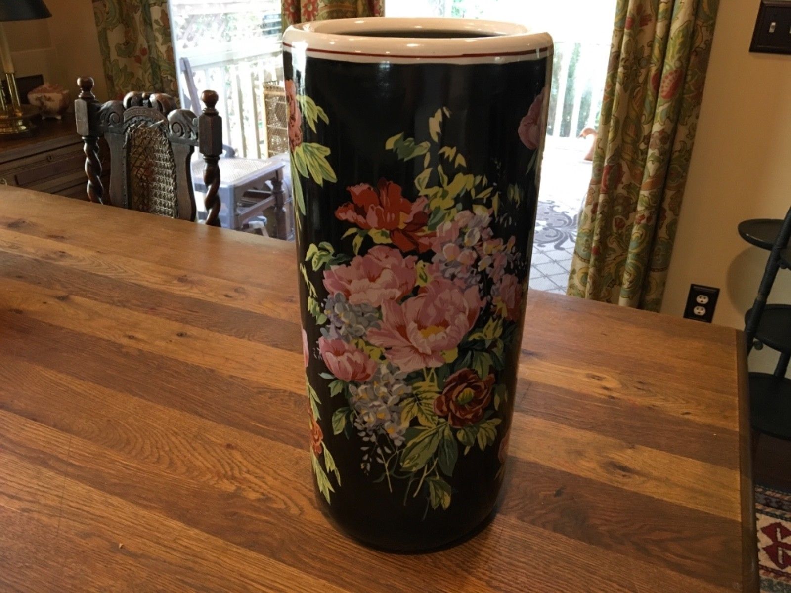 LOVELY!VTG CHINESE CERAMIC/PORCELAIN UMBRELLA STAND BLACK-PINK& BURGUNDY FLOWERS