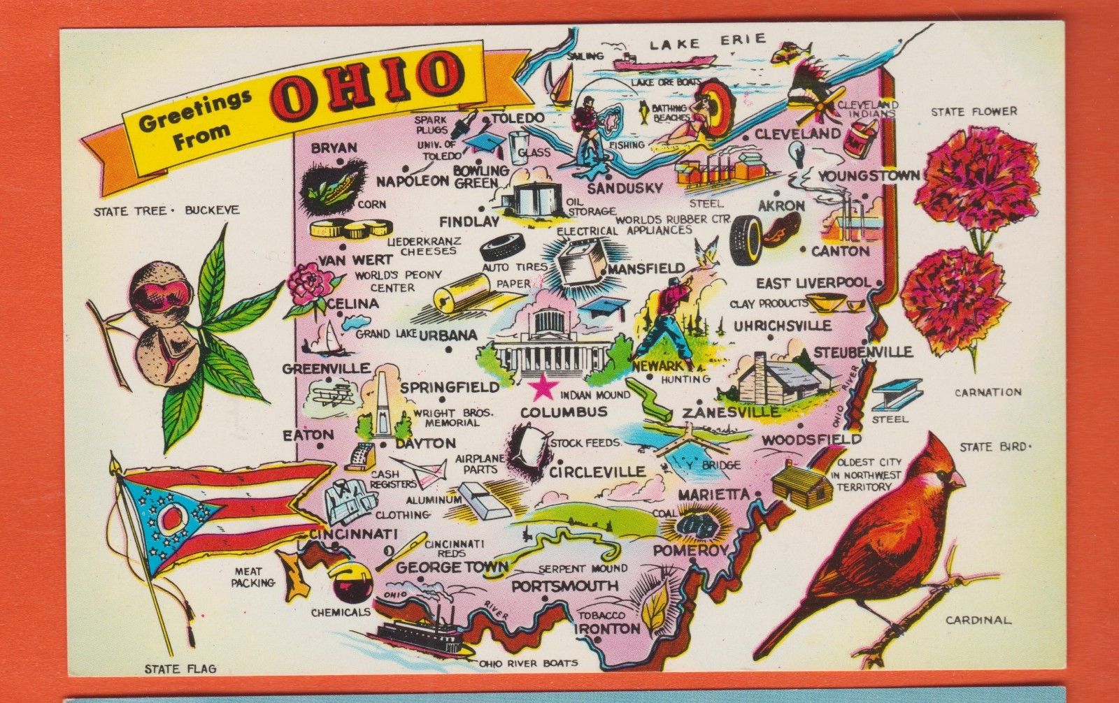 Greetings from Ohio/ map of Ohio/ different pics/ chrome postcard