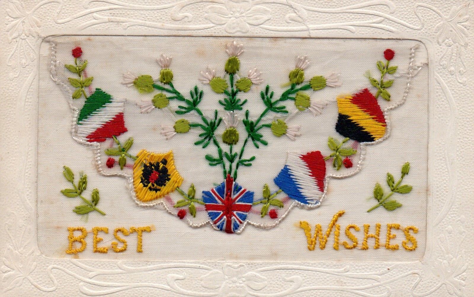 Title (ebay affiliate link): BEST WISHES: WW1 EMBROIDERED PATRIOTIC SILK POSTCARD