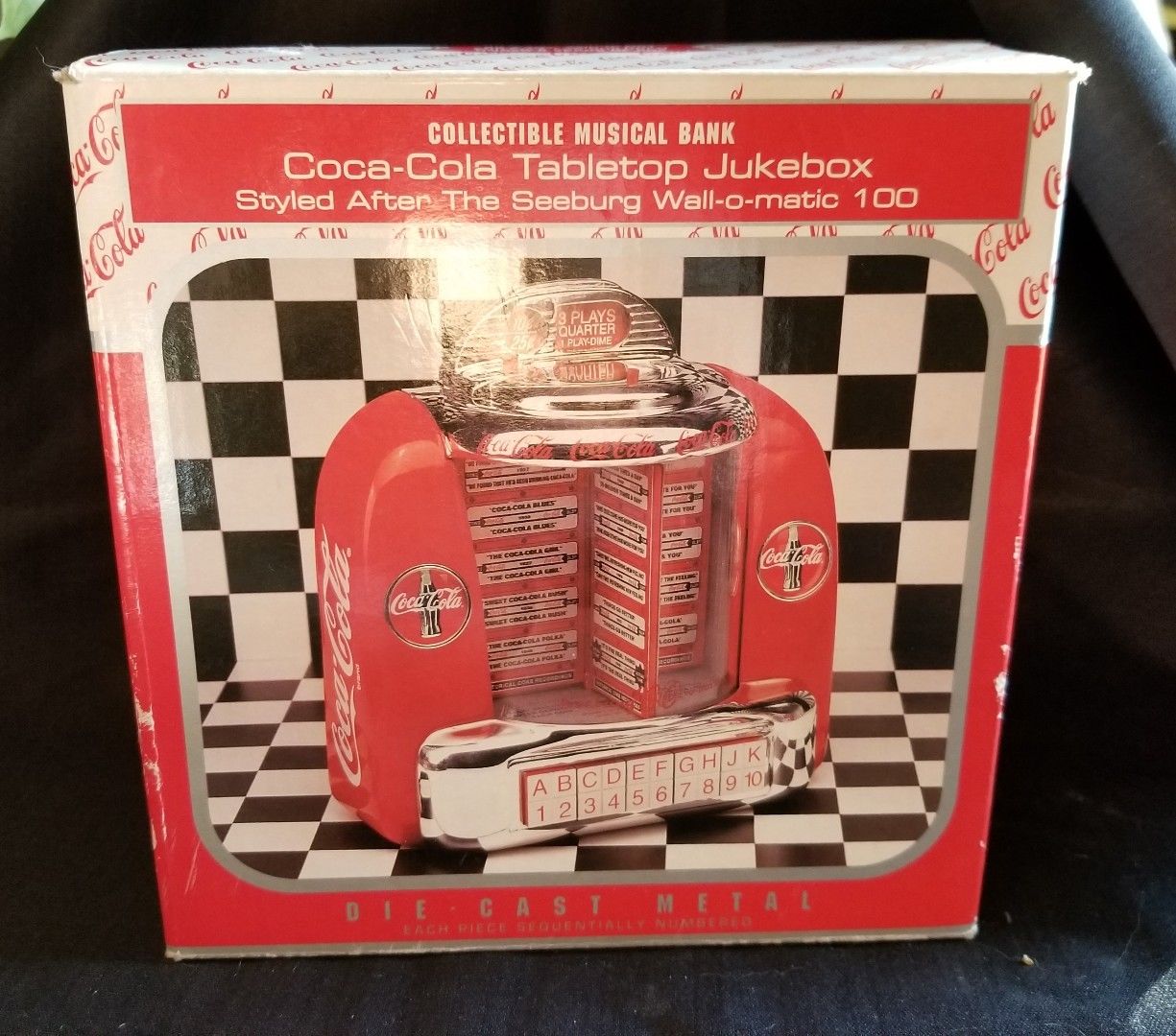 Title (ebay affiliate link): Coca-Cola Coke Die Cast Musical Bank Tabletop Jukebox Original Box 1996 Works