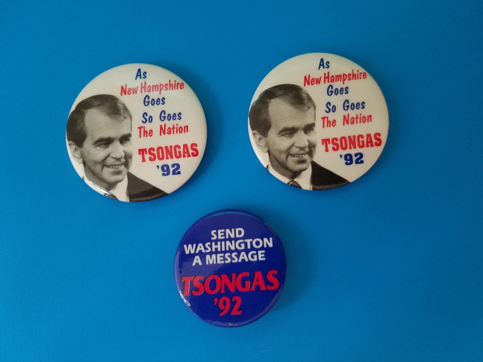 Title (ebay affiliate link): 3 Tsongas 92 New Hampshire campaign pin buttons political
