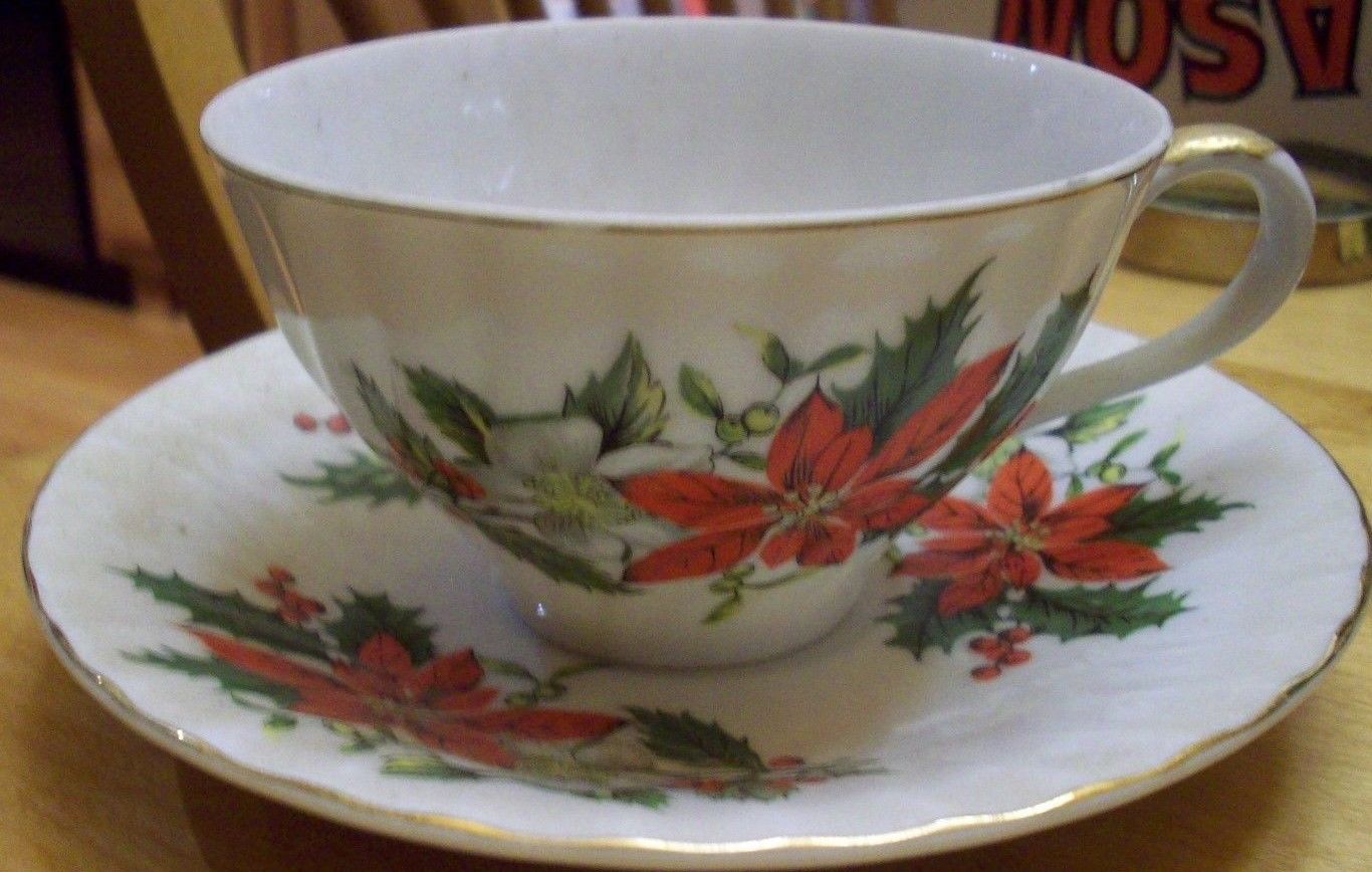 Title (ebay affiliate link): Vintage NORCREST Fine China Tea Cup and Saucer Christmas Pointsetta Gold Trim