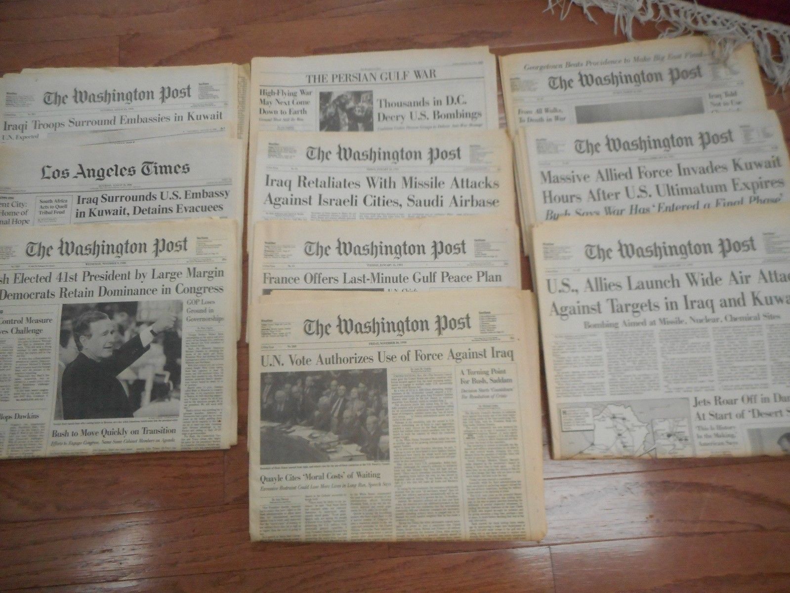 Title (ebay affiliate link): George H W Bush NEWSPAPERS 1988+1990-91 Pres Win Gulf War Wash Post LA Times