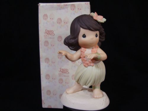 Title (ebay affiliate link): Precious Moment-Dancing Hawaiian Girl/Grass Skirt/Lei-Happy Hula Days-Nice Piece