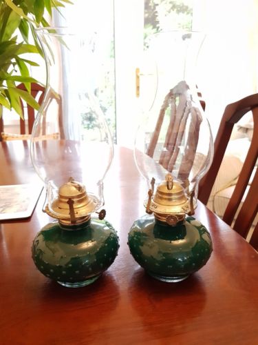 Title (ebay affiliate link): Pair Of Vintage Green Glass Oil Lamps With Glass Chimneys