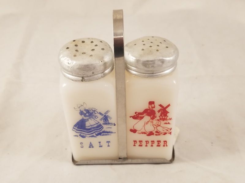 Title (ebay affiliate link): Milk Glass Windmill Salt and Pepper Shaker Set w/ Table Top Holder 3 1/2"