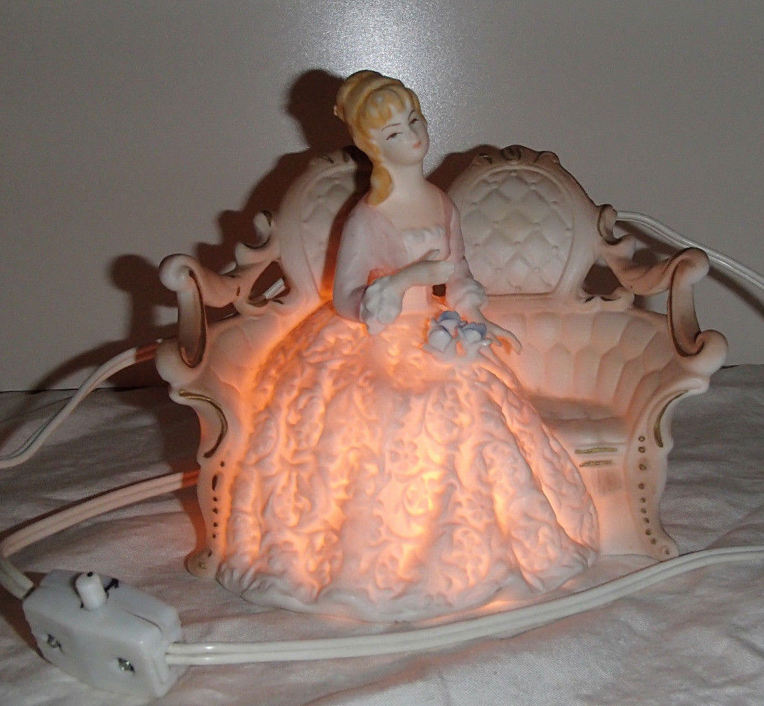 Title (ebay affiliate link): Vintage Porcelain blonde lady provincial Settee lamp night light marked 7939