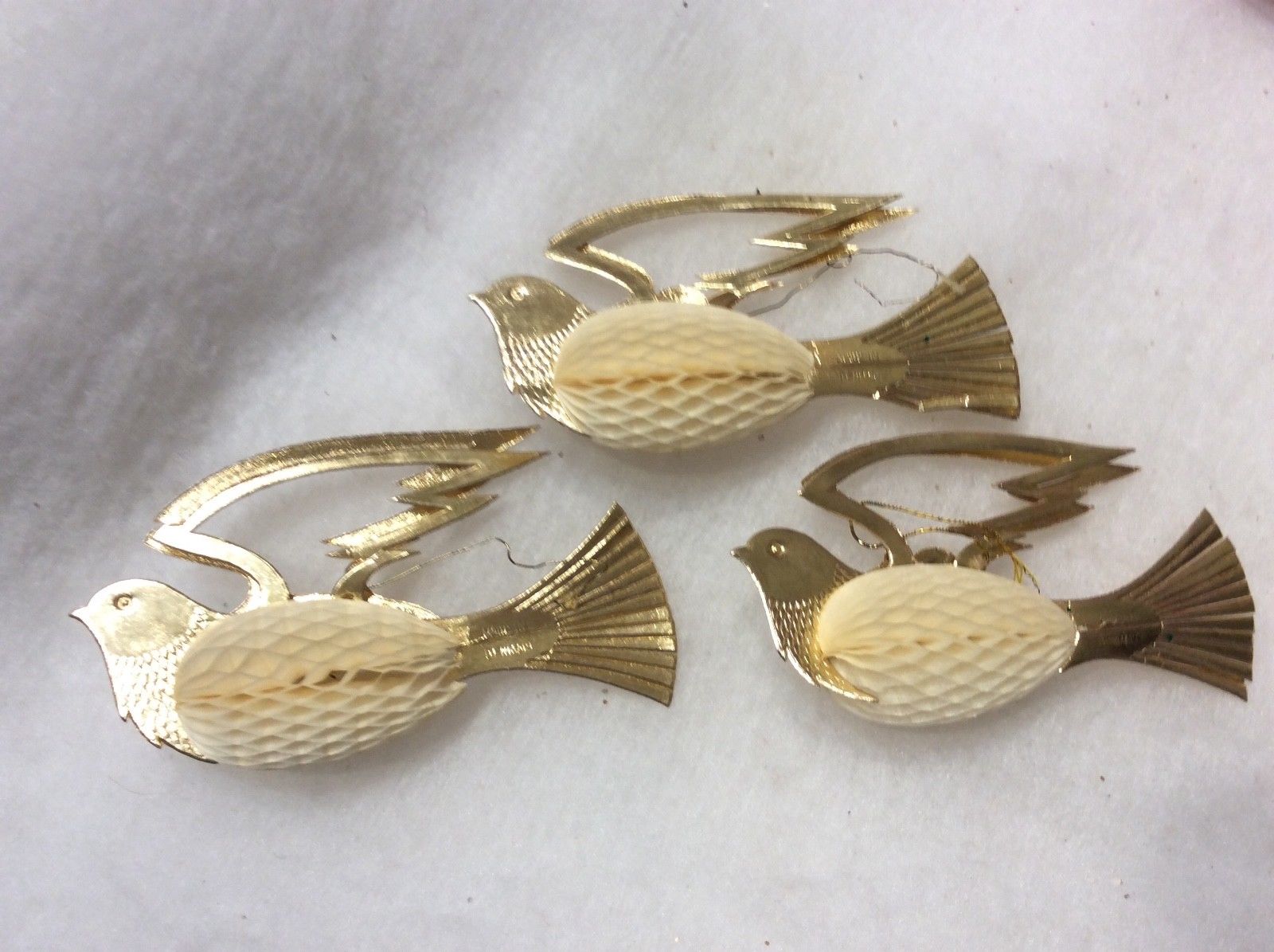 3 Vintage Gold Bird Honeycomb Christmas Ornaments