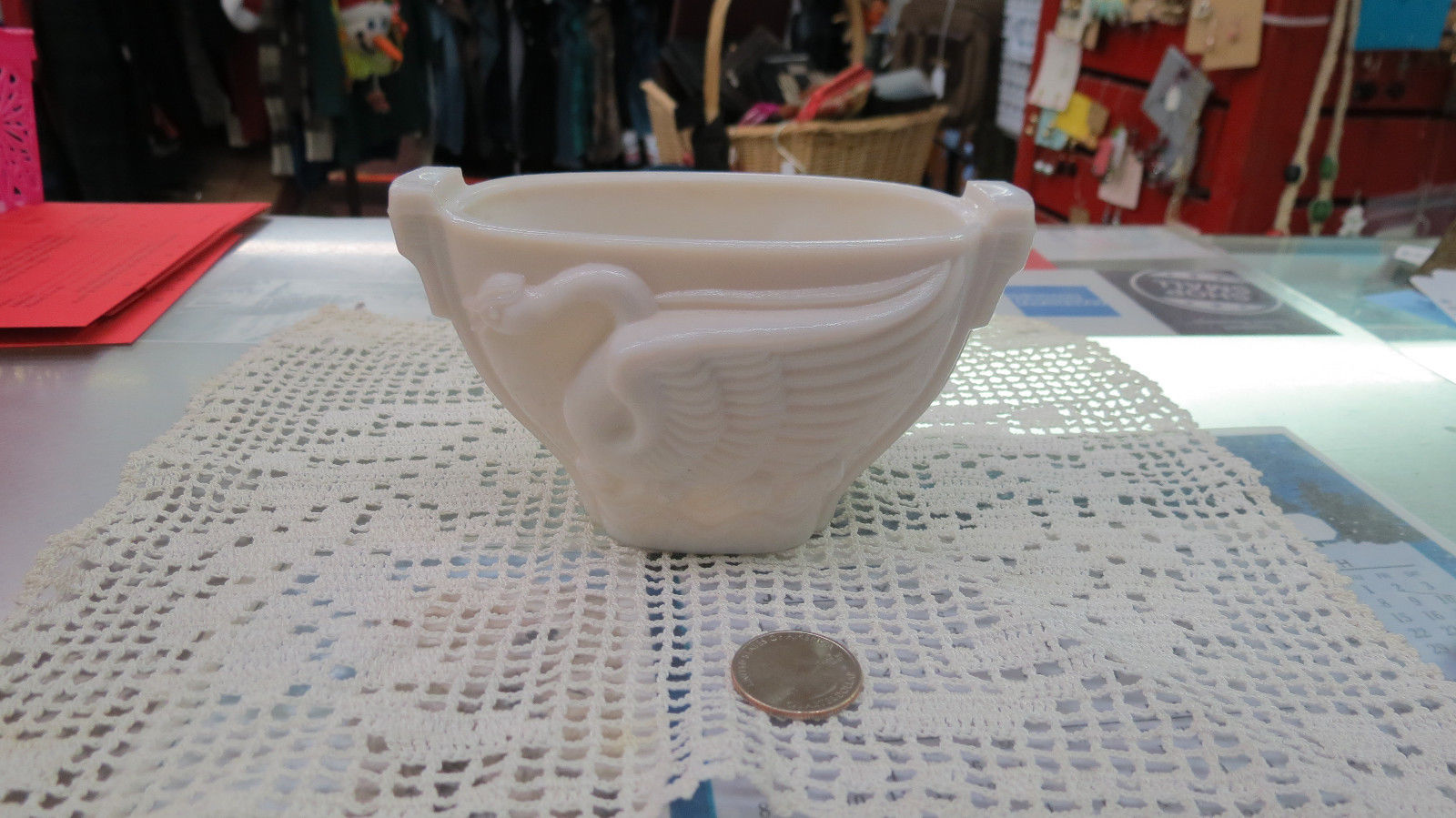 Title (ebay affiliate link): 2 Vintage Art Deco Milk Glass Bowl Dish Monax Swan Bird 1930''s White USA