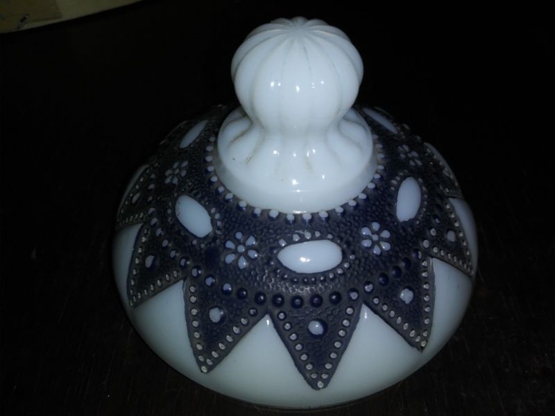 Vintage White Milk Glass Dish Lid With Black Lace Design