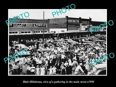 OLD LARGE HISTORIC PHOTO OF BLAIR OKLAHOMA, GATHERING IN THE MAIN STREET c1950