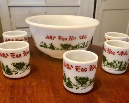 Title (ebay affiliate link): Hazel Atlas Milk Glass Christmas Egg Nog Punch Bowl & Mug Set Holiday Carriage
