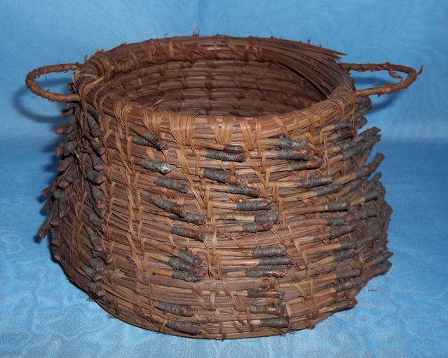 Title (ebay affiliate link): Antique American Pine Needle Woven Basket w Handles Bowl 3 Color Brown Green Old