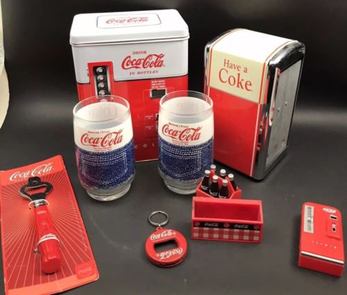 9 Piece COCA COLA COKE SET NAPKIN DISPENSER GLASSES MAGNETS OPENERS TIN