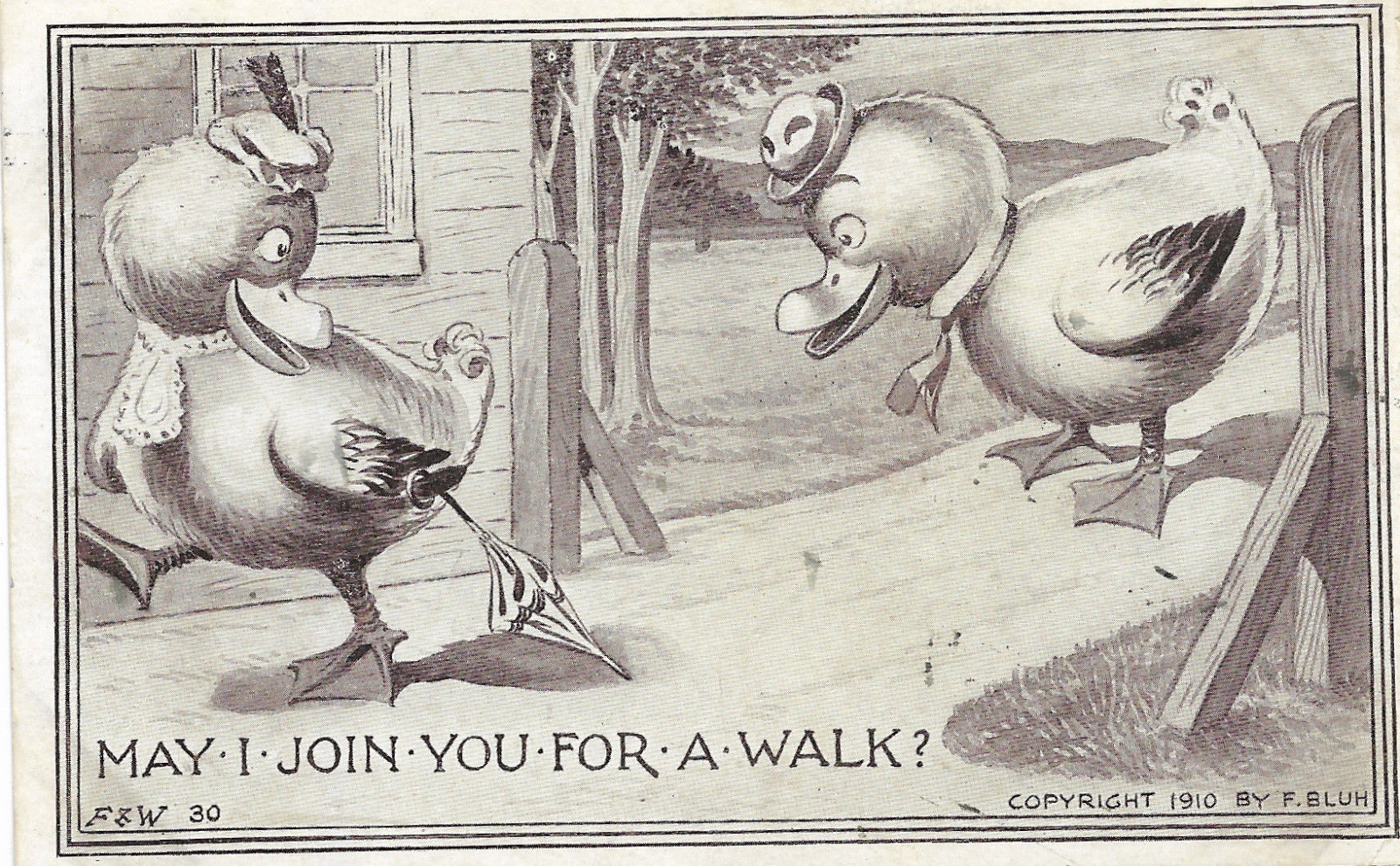 MAY I JOIN YOU FOR A WALK? says the male duck to the female CPYRT 1910 F Bluh