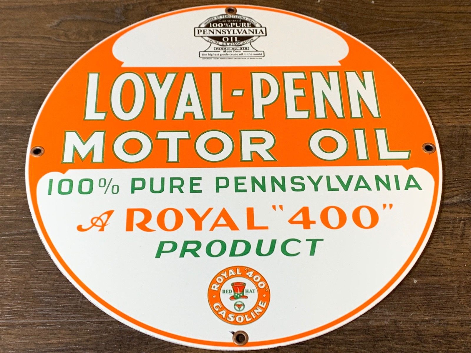 VINTAGE LOYAL-PENN MOTOR OIL PORCELAIN 12 METAL SIGN RED HAT ROYAL 400 GASOLINE