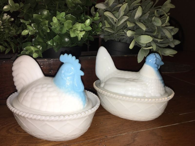 Title (ebay affiliate link): Vintage Pair Milk-glass Covered Hen And Rooster On Basket Lidded Dish