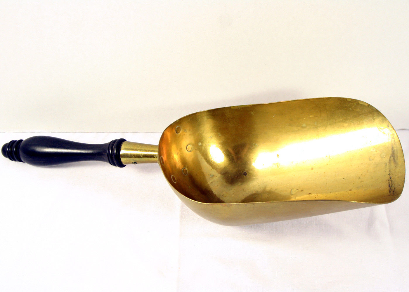 Title (ebay affiliate link): Vintage Large Brass Scoop With Turned Wooden Handle Some Oxidation.